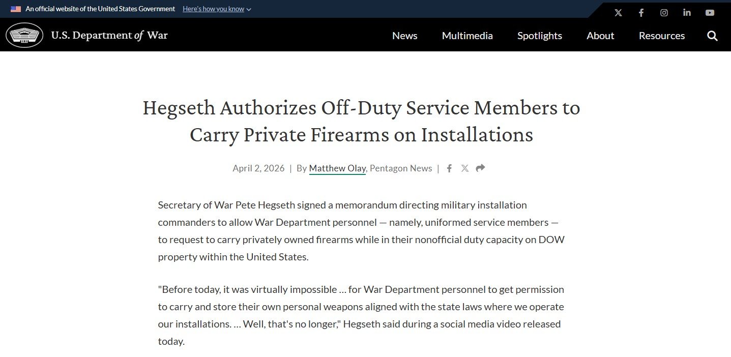 Much social media fuss has been made over the last 24 hours regarding the announcement by Secretary of War Pete Hegseth that military service members who are off-duty may request permission to carry personal defensive firearms. He explained this in a video posted to his X account: